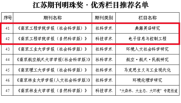 近日,江苏省期刊协会发布《关于江苏期刊明珠奖·优秀栏目推荐结果的通报》《关于江苏入选第七届华东地区期刊“优秀栏目”推荐活动的通报》,beat365官方网站学报(社会科学版)“典籍英译研究”、beat365官方网站学报(自然科学版)“电子信息与控制工程”2个栏目被评为江苏期刊明珠奖·优秀栏目;其中“典籍英译研究”栏目被推荐参评华东地区期刊“优秀栏目”并成功入选。江苏期刊明珠奖是由江苏省期刊协会组织评选的重要期刊奖项,旨...