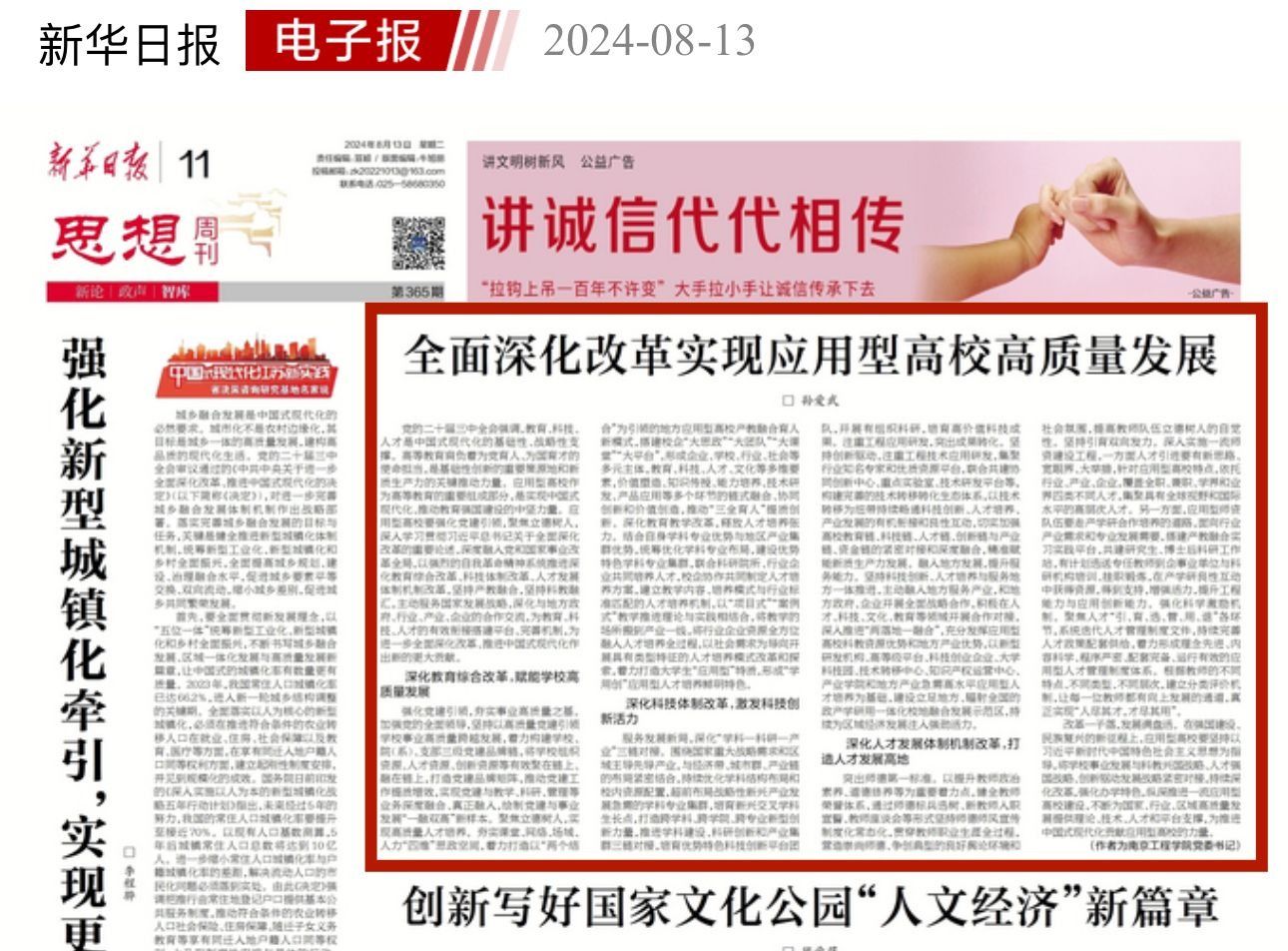 8月13日,《新华日报》思想周刊刊发beat365党委书记孙爱武题为《全面深化改革实现应用型高校高质量发展》的署名文章。文章结合党的二十届三中全会精神和应用型高校发展实际,从“深化教育综合改革,赋能学校高质量发展”“深化科技体制改革,激发科技创新活力”“深化人才发展机制体制改革,打造人才发展高地”三个方面,深刻阐述了纵深推进一流应用型高校建设的路径和方法。全文转载如下:党的二十届三中全会强调,教育、科技、人...