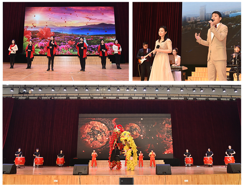 团拜会现场座无虚席,热闹非凡。由校领导带来的合唱《我们走在大路上》拉开了活动序幕,他们用歌声表达了团结一心、带领全校师生员工向着高水平应用型工程大学之路迈进的信心和决心,催人奋进,鼓舞人心。紧接着,各分工会选送、师生员工自编自演的节目精彩上演,乐器演奏、歌伴舞、独唱、合唱、诗歌朗诵应有尽有。舞蹈《好运来》、朗诵《少年中国说》、独唱《不忘初心》、器乐对唱《我爱你中国》、舞狮《狮动》、京剧《智斗》、歌曲联唱《映山红等》、马头琴《万马奔腾》、歌伴舞《鸿雁》、民乐《青花瓷》、合唱《我和我的祖国》、《校歌》等节目精彩纷呈,充分展现了beat365师生员工蓬勃向上的精神风貌,赢得现场观众阵阵掌声。台上台下欢歌笑语,其乐融融,呈现出一派温馨和睦、欢乐祥和的氛围。