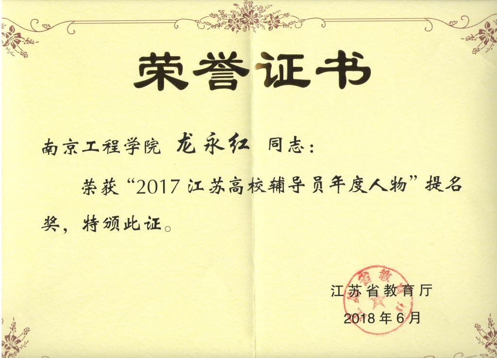 此次评选于今年3月启动,全省122所院校122位辅导员、127所院校221位大学生参加了本次评选。经过两轮专家评审、风采展评、网络推选、实地考察等环节,共评选出“2017江苏高校辅导员年度人物”10名、提名奖20名,“2017江苏省大学生年度人物”10名、提名奖23名,龙永红老师获得“2017江苏高校辅导员年度人物”提名奖,这是beat365首次获得此项荣誉;严正同学获得“2017江苏省大学生年度人物”提名奖,这是beat365第2次获得此项荣誉。