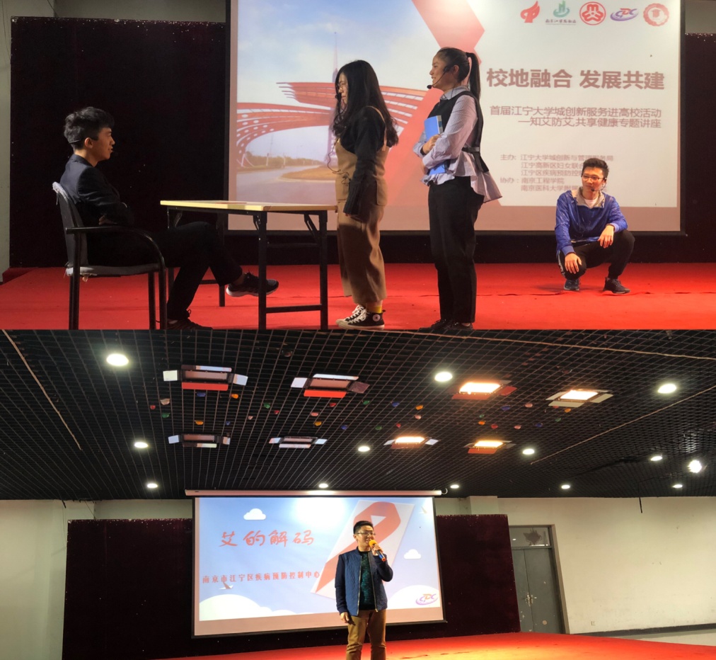 12月5日下午,至馨苑·综合服务楼广场上,来自中国药科大学青年志愿者表演的情景小剧拉开了江宁高新区“四个一进校园”活动的帷幕。“四个一进校园”即一场防艾情景剧,一份防艾宣传册,一套防艾计生用品,一堂防艾知识讲座。
