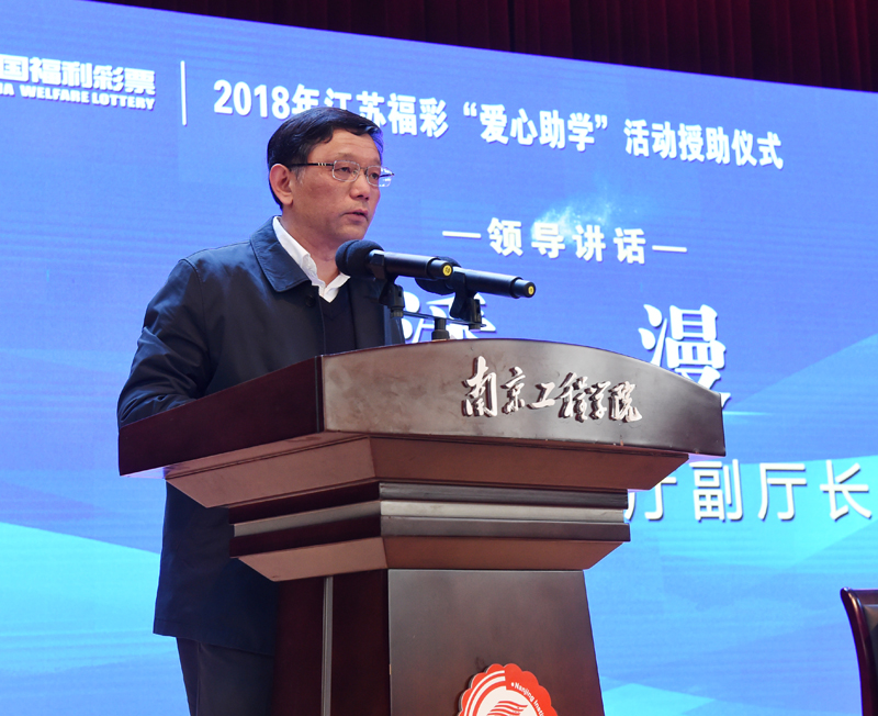 潘漫副厅长在讲话指出,江苏福彩“爱心助学”活动已经成为江苏教育系统规模最大、受众最广的“情寄贫困学子,关注英才成长”的公益资助品牌工程,对激励和帮助我省高校家庭经济困难大学生克服困难、奋发图强、顺利完成学业、努力成长成才发挥了不可替代的独特作用。捐资助学活动,受益的是贫困学生,受助的是贫困家庭,体现是江苏福彩的一份关爱、一份真情。他希望受助同学把社会各界的拳拳爱心化作勤奋学习的巨大动力,潜心求学、勇于担当、乐于奉献,为实现两个一百年奋斗目标和中华民族伟大复兴的中国梦作出自己应有的贡献。
