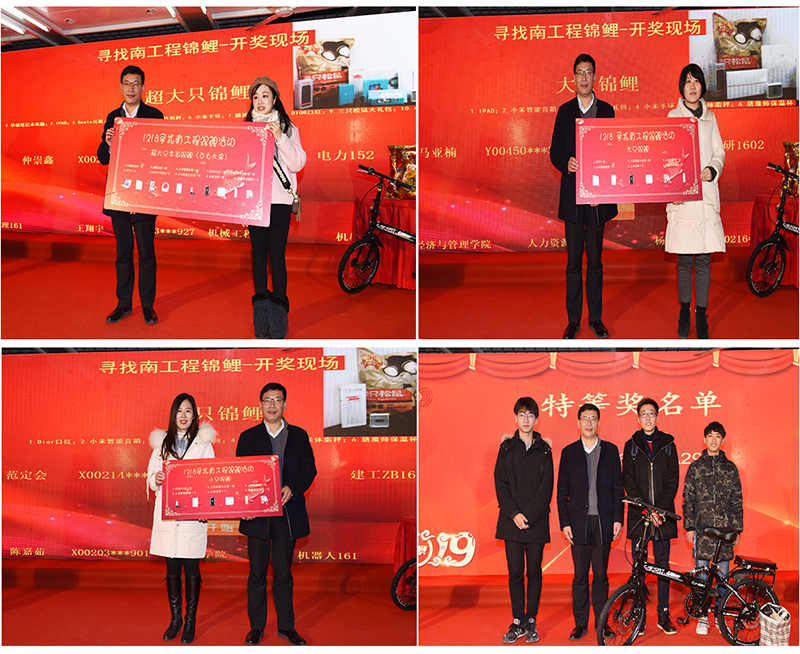 晚上21:00是激动人心的抽奖环节,同学们紧握奖券,期待自己赢取大奖。相关职能部门领导、各学院(中心)领导、学工办主任及分团委书记在现场共抽取一、二、三等奖及特等奖共计133份。奖品包括折叠自行车、小米蓝牙项圈耳机、保温杯、旺旺零食大礼包等。每一位幸运儿的脸上都洋溢着幸福的笑容,激动地迎接了新年的第一份幸运。最后,本次游园会的重头戏“寻找南工程锦鲤”活动压轴登场。张仰飞副院长在现场抽取了一只“超大只锦鲤”、 一只“大只锦鲤”、 一只“小只锦鲤”和20位“幸运小宝”,奖品包括华硕笔记本、ipad、荣耀手机、Beats耳机等。来自电力工程学院的仲崇鑫、研究生处的马亚楠,建筑工程学院的范定会成为本年度南工程锦鲤。此外,校团委微信公众平台推出了为期三天的抽奖活动,采用线上线下同时开展游园会活动的模式,给beat365学子们带来了新年的欢乐与喜悦。