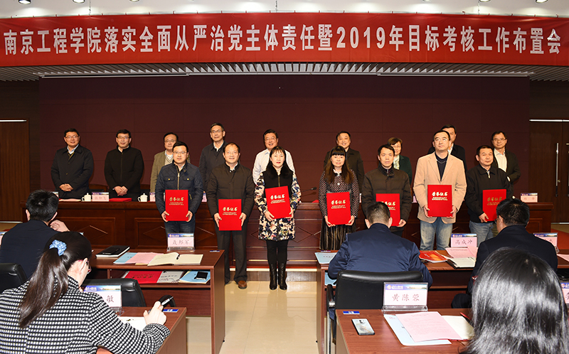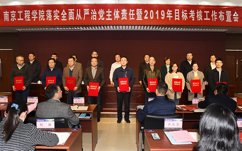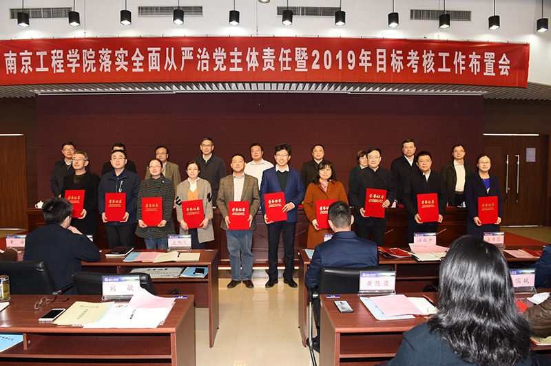 大会对2018年度目标考核优秀单位进行了表彰,党委副书记、副校长曹雪虹宣读2018年度目标考核表彰决定;校领导为2018年度目标考核优秀单位代表颁奖;党委委员、副院长朱晓春介绍“2019年度目标考核实施方案”;二级基层党组织及职能部门负责人向党委书记史国君递交了党风廉政建设责任书和落实意识形态工作责任制任务书;二级部门(单位)负责人向史金飞院长递交2019年度目标考核责任书、校园治安综合治理责任书和消防安全责任书。