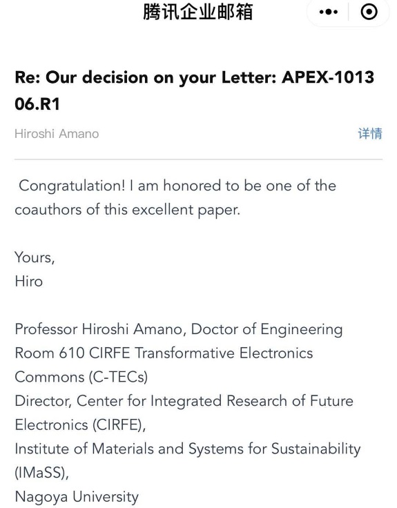 诺奖得主Hiroshi Amano教授发来邮件给予高度肯定