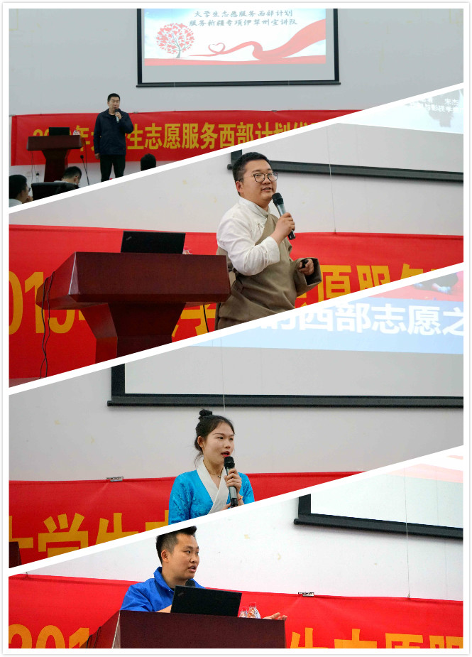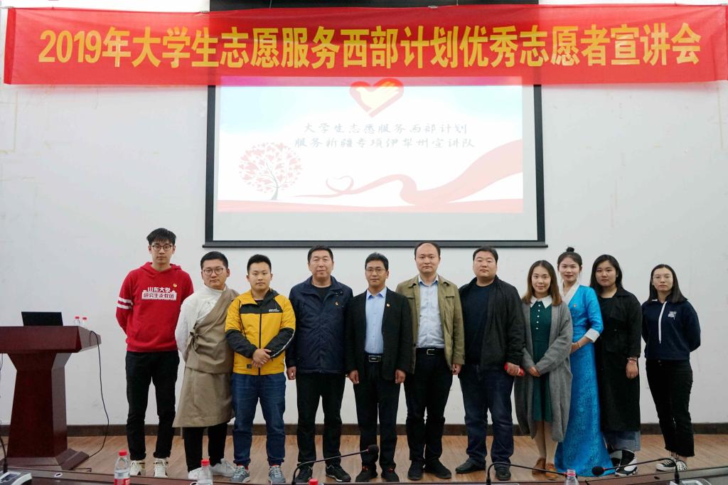 按照团省委的统一部署,4月15日下午,西部计划西藏专项宣讲团一行7人,新疆伊犁自治州宣讲团一行3人在beat365文博苑·逸夫图书信息中心二楼学术报告厅举行了2019年大学生志愿服务西部计划宣讲会。校团委负责人以及200余名即将毕业的各专业学生代表参加了宣讲活动。