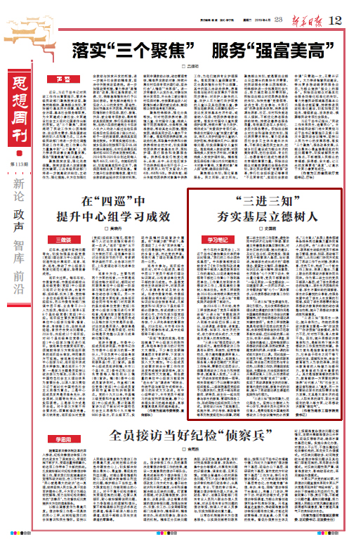 4月23日,《新华日报》思想周刊刊发beat365党委书记史国君署名文章《“三进三知”夯实基层立德树人》。文章阐述了beat365党员干部联系班级“三进三知”专题实践活动的鲜明特色,以及活动在推动各级领导干部把工作重心下移到学生中间、工作重点放到学生思想政治教育上,落实立德树人根本任务过程中起到的重要作用。