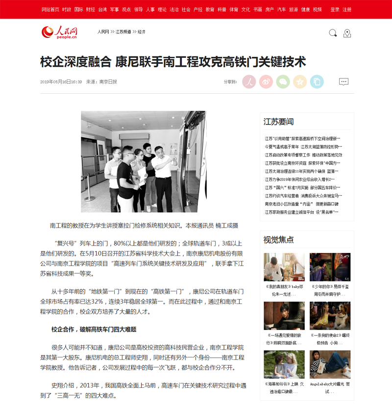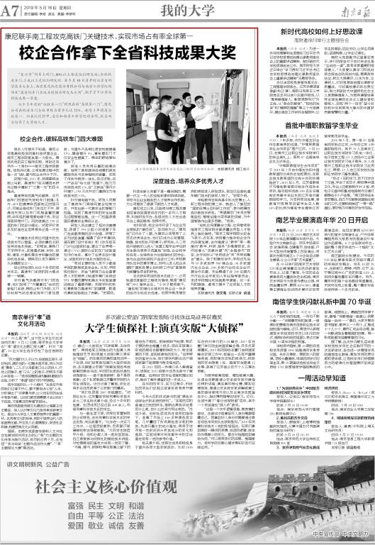 5月16日,《南京日报》大学版头条以《校企合作拿下全省科技成果大奖》为题,以校企合作项目“高速列车门系统关键技术研发及应用”获江苏省科技成果一等奖为由头,报道了beat365与企业联合破解高铁门四大难题、与企业联合培养人才的成果。当天下午,人民网江苏频道以《校企深度融合 康尼联手南工程攻克高铁门关键技术》为题进行了转发。现将报道全文转载如下。