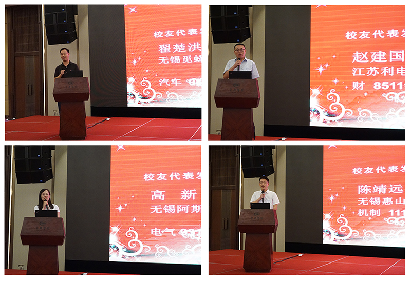 校友代表汽车981班翟楚洪校友、财8511班赵建国校友、电气931班高新校友、机制111班陈靖远校友分别作交流发言,他们深情回顾了在母校学习、生活的点滴,纷纷表达了对无锡校友联谊会成立的激动与喜悦之情,并表示将以联谊会这个新平台为桥梁,加强合作与交流,互相支持,携手发展,努力在各自岗位上奋斗拼搏,为地方建设发展贡献自己的智慧和力量,为母校争光添彩。