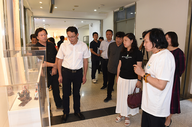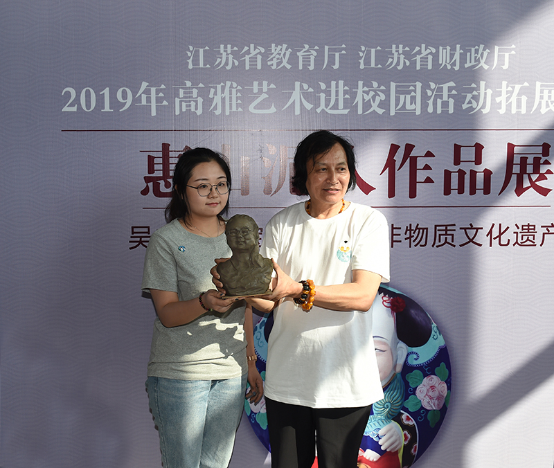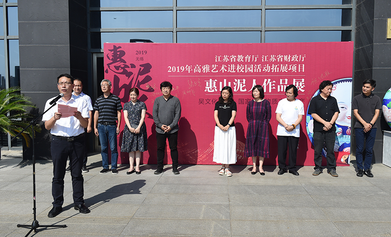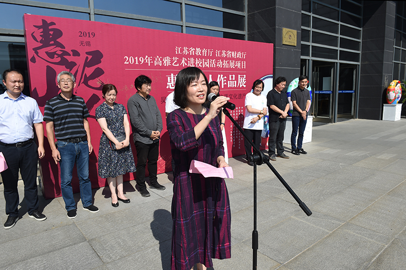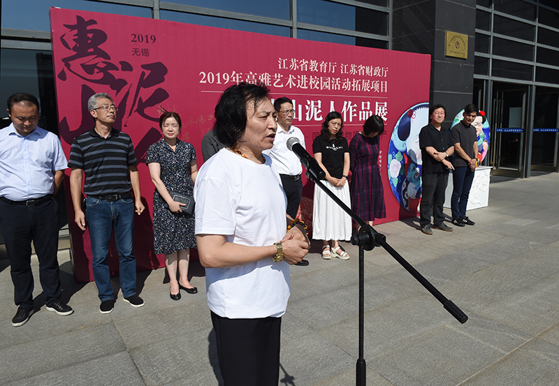 江苏信息职业技术学院辛春晖副书记向大家介绍了该校的发展概况、校园文化、人才培养和品牌特色,她介绍说,为了更好地传承创新中华优秀传统文化,打造自身品牌优势,学校内建有徐根生泥人大师工作室、赵红育精微绣大师工作室,并定期举办讲座,在进一步激发吴文化瑰宝的生机与活力的同时,增强师生的文化自信。她表示,此次展览能够让同学们在“见人见物见生”中感受到惠山泥人这一国家级非物质文化遗产项目的博大与精深,能够在传统与现代、继承与创新之间实现传统文化的薪火相传。