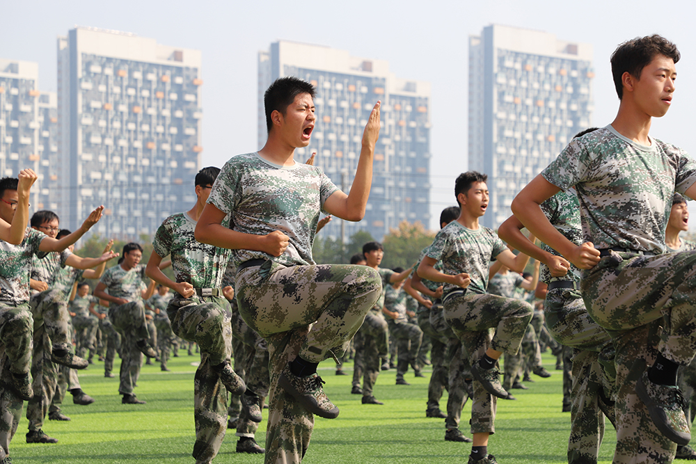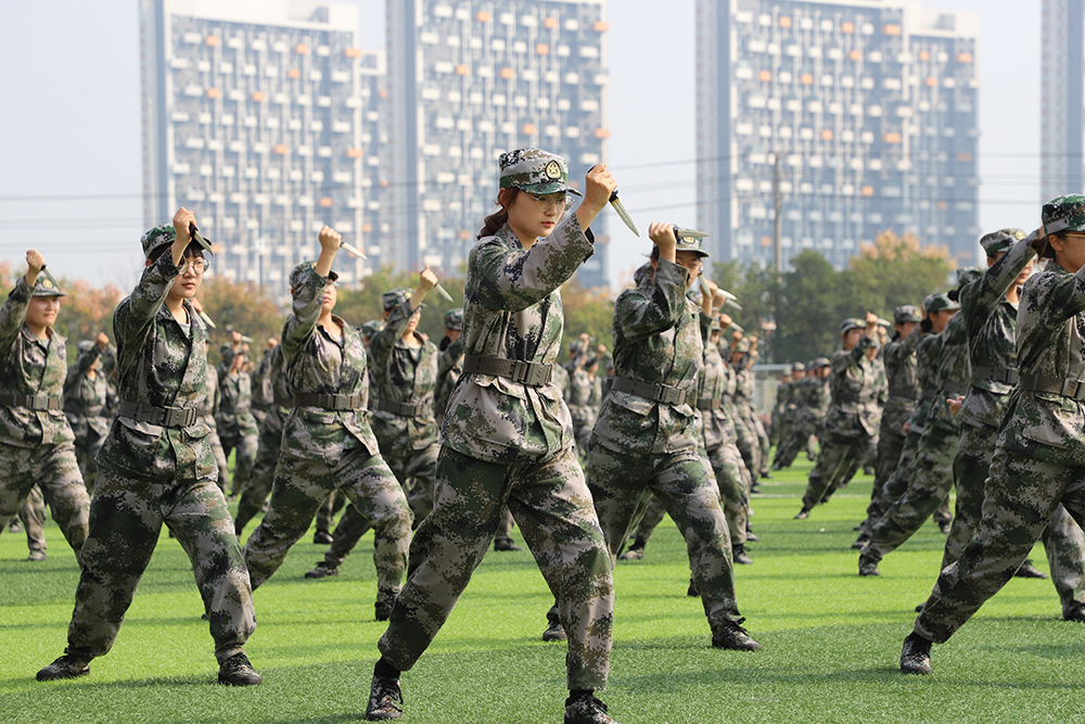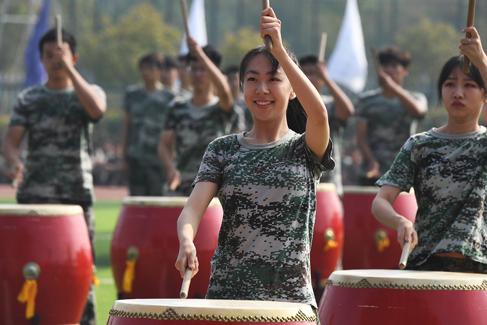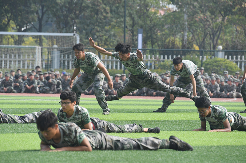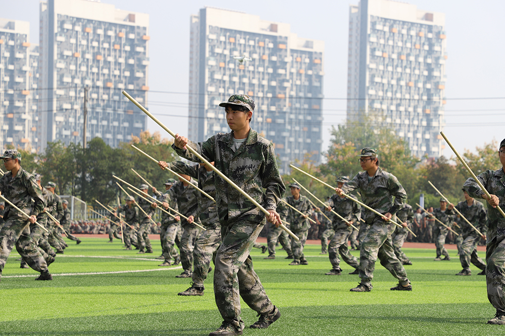 分列式后,表演科目方阵陆续登场。天印大鼓,鼓动心弦,振奋人心,满怀激情的鼓手在肆意挥洒着汗水,为军训的青春与汗水助威呐喊;800人组成的军体拳方阵队列整齐,行动一致,出拳虎虎生威,踢腿凌厉有力,他们斗志昂扬,他们势如雷霆;应急棍方阵动作整齐、精准,虎步生风,手中之棍如行云流水,劈击弹踢,棍棍有力,势如破竹;女子匕首操方阵由600名新生组成,铿锵玫瑰,在那力竭之际,在那坎坷之时,定会昂首迈出坚毅的步伐,用匕首斩断前方的荆棘;800人组成的擒敌拳方阵一招一式行云流水,刚劲有力,气吞山河,势如破竹。力如千斤压顶,劲似利箭穿革。