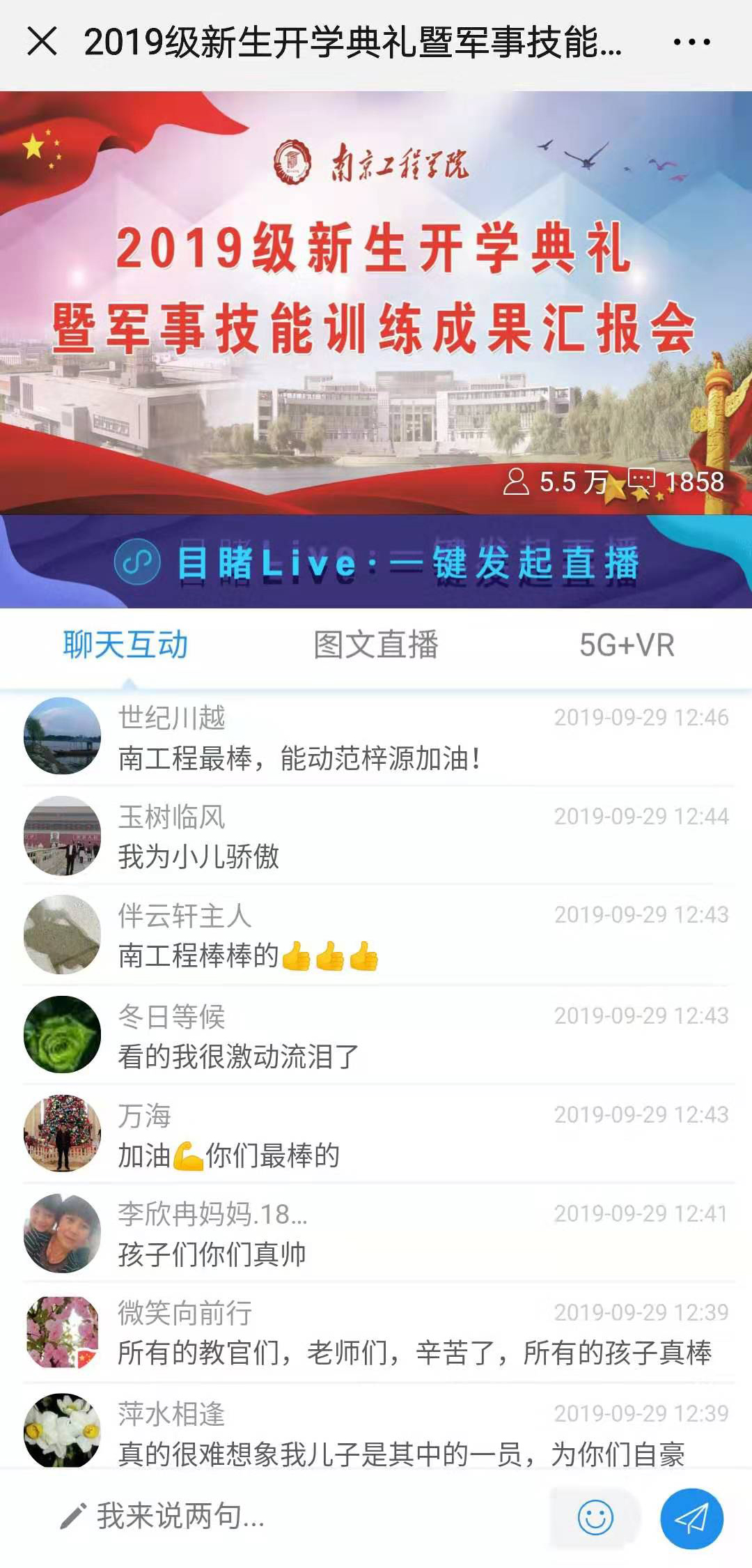 今年的开学典礼暨军事技能训练成果汇报会首次采用现场“5G+VR”网络直播的方式。在现场,通过一个“圆球”状的全景VR摄像机,依托先进的5G技术,实现360°超高清视频直播,给大家带来了多维度、个性化、零距离的全新直播体验。截止到下午2:00,通过观看直播的人数已有5.5万人次,观众纷纷留言点赞,好评连连。