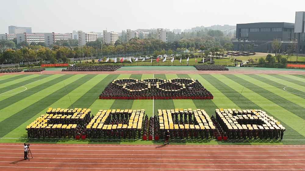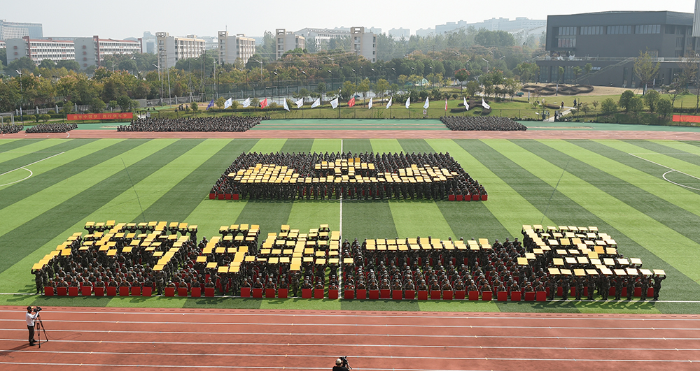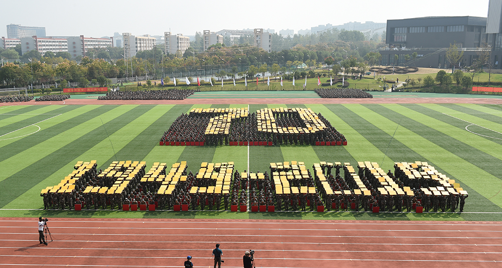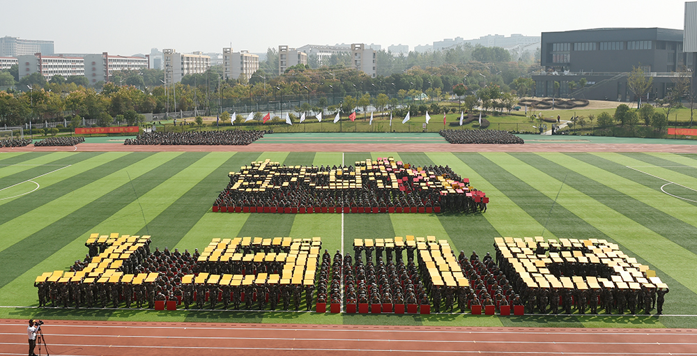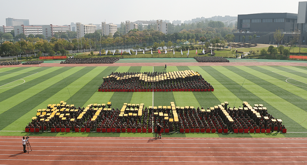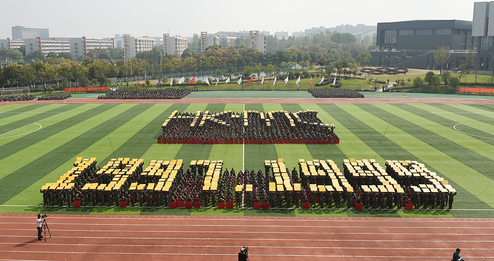 在《我爱你中国》的悠扬歌声中,大红色的航天模型悄然起飞,带着鲜艳的五星红旗和对新生的美好祝愿,在会场中心盘旋。在举国上下庆祝新中国成立七十周年的热潮中,这一幕特别演出瞬间点燃了全场师生的爱国热情。伴随着震撼人心的口号,近1500名参训学生用队列编排出的“1949-2019”“70” “两弹一星”“1978·春天的故事”“HK•MC”“2008”“新时代”“中国梦”“南工梦”“大学梦”“我的梦”“不忘初心,筑梦前行” “祖国万岁”等字样以及党旗、国旗、地图、火箭、五环、“一带一路”等图案,通过展现新中国成立以来的各个重大时间点,带领师生们回顾新中国的辉煌成就,以此表达对祖国母亲的热爱,共同祝愿祖国更加繁荣昌盛。队列还摆成 “NJIT”等元素,展示了当代大学生爱党爱国爱校的情怀和自强不息、奋勇前行的时代宣言。同学们整齐划一的动作、势破重霄的呐喊、震撼人心的造型将汇报表演推向高潮,博得了阵阵掌声。