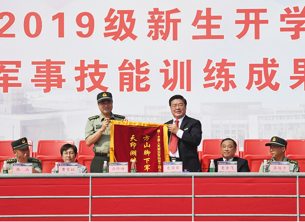 在热烈的掌声中,党委书记史国君向军训承训单位赠送锦旗表达谢意。汇报会还对军训工作中取得优异成绩的先进集体和个人进行表彰,党委常委、副院长杨征宇宣读了2019级新生军训表彰决定。