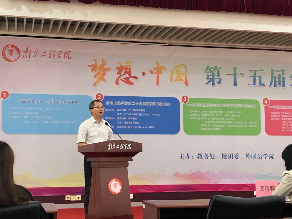 郑锋副院长致开幕词。他指出,外语文化交流节活动形式多样、精彩纷呈,学生参与度高,已成为繁荣校园文化的品牌活动,尤其是在学校深入开展“不忘初心、牢记使命”主题教育大背景下,本次交流节以“梦想·中国”为主题,旨在全球化的语境中弘扬中华传统文化,讲述中华民族为实现“中国梦”而奋斗的故事,一定能有效激发学生的爱国热情、文化自信和传播中国文化的使命感,他希望莘莘学子充分利用此浓厚的素质教育氛围,提高跨文明交际的意识和能力,努力成为具有国际竞争力的现代化人才,以“宏毅”精神酬强国梦想。