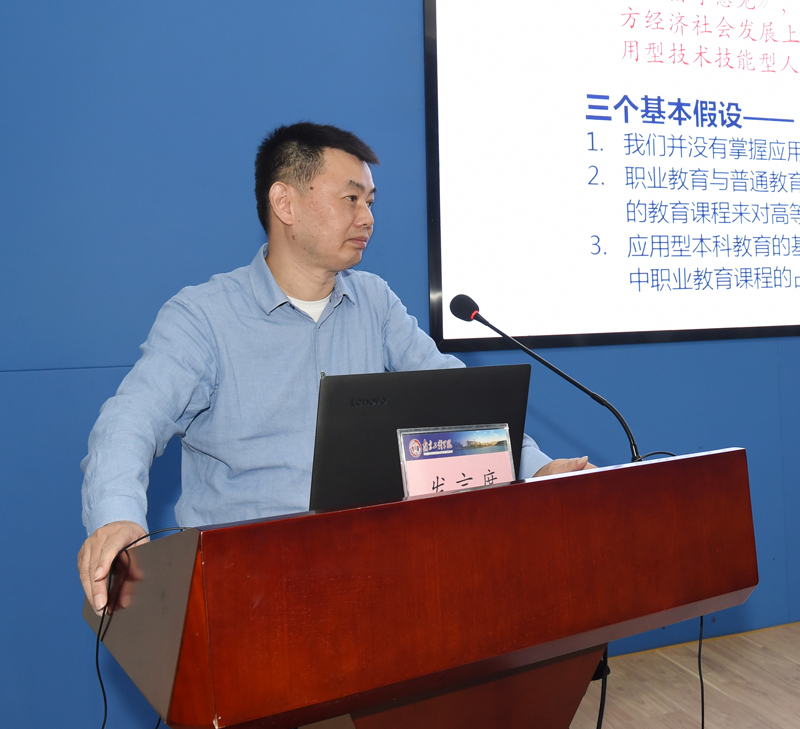 袁靖宇院长的报告以《应用型本科发展:职业教育的视角与启示》为题,从职业教育的视角关照应用型本科的发展。他提出,应用型本科教育教学要从教师、教材、教法等出发,全方面向高职教育学习,最重要的是学习职业教育的眼光和思维。他通过对职业教育的本质观、环境观、发展观、质量观、教学观、产业观、体系观、项目观、国际观和舆论场这十个维度的深入分析,指出了职业教育为应用型本科发展带来的三大启示,其一,大学的高水平与应用型并不矛盾,其二,产教融合、校企合作、工学结合是应用型大学的本质特征,其三,成为创业型大学、教学、科研、经济融为一体是应用型大学的发展趋势。袁靖宇的报告具有很强的前瞻性、针对性,提出了促进应用型本科院校发展的路径思考,对推进全省应用型高校的内涵发展提供了新的启示。
