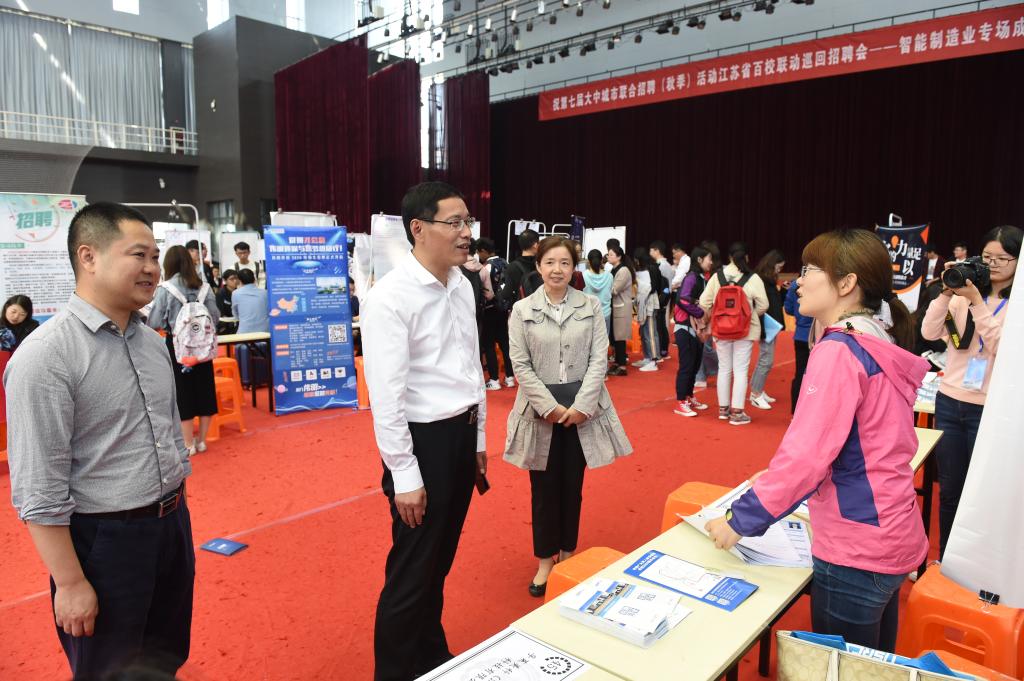10月24日,第七届全国大中城市联合招聘高校毕业生秋季活动江苏系列招聘会——智能制造业专场在beat365天健苑·大学生体育中心举办。校党委常委、副院长张仰飞来到招聘会现场,与用人单位和毕业生进行深入交流。