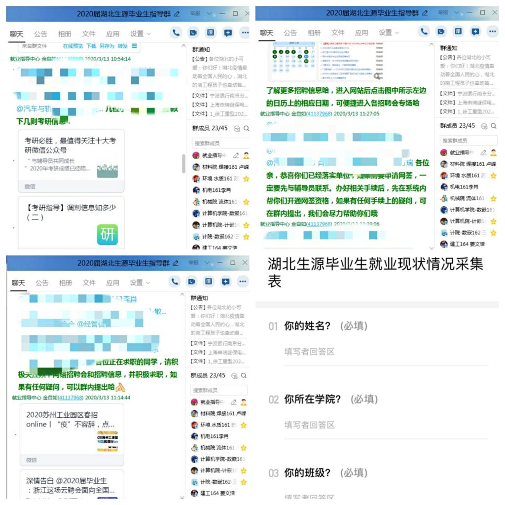 学校高度并密切关注毕业生思想动态,通过电话、QQ、微信等通讯媒介,切实畅通与毕业生的联系,了解未就业毕业生的思想动态和就业诉求。实行就业信息动态周报制,及时更新摸底数据。各学院(中心)组织开展“人盯人”“一人一策”模式的就业指导,在准确摸底充分了解毕业生求职意愿和目前就业状况的基础上,及时、精准、有效开展分类指导和服务。引导尚未落实就业单位的毕业生,理性认识形势,合理调整预期,通过提供修改简历、投递简历、面试指导等服务,帮助学生主动把握各类用人单位春季招聘尤其3月份的“黄金机遇期”。密切关注2020年考研工作动态,及时将学生考研复试安排、调剂申请等相关工作安排通知到每一位考研学生,充分挖掘学院、学校的优质教师资源,积极向研究生招生单位推介报考的学生,指导考研学生认真做好复试准备和心理调适,提高复试成功率。对拟考公考编等各类专项就业的群体,引导学生做好“两手准备”,积极主动谋划求职。同时,密切关注疫情重点防控地区的毕业生、建档立卡家庭经济困难毕业生以及就业能力较差毕业生等群体,并及时给予“一对一”帮扶。针对受此次疫情影响较重的42名湖北生源毕业生,学生工作处专门建立了 “2020届湖北生源毕业生指导群”,对每位学生的就业现状开展了在线调查与点对点的帮扶。目前有12名学生已顺利签约,8名学生正在积极准备考研复试,另外22名暂未就业的学生也在积极参加网络招聘。