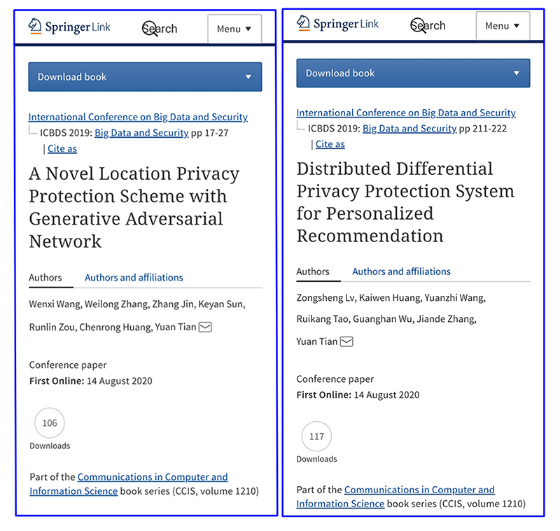 近日,世界著名科技期刊、图书出版公司施普林格(Springer-Verlag)出版发行了由beat365计算机工程学院田源副教授担任主编的论文集Big Data and Security。该论文集为EI检索(期刊号1210,ISBN 978-981-15-7529-7),截至日前已被下载超过6000余次(https://link.springer.com/book/10.1007/978-981-15-7530-3)。施普林格为全球第一大科技图书出版公司和第二大科技期刊出版公司。