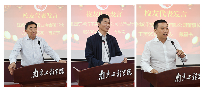 校友代表机203班吉立东、锻8004班周永南、工美9581班戴福书分别作交流发言,他们深情回顾了在母校学习、生活的点滴,纷纷表达了对南京校友联谊会成立的激动与喜悦之情,并表示将以联谊会这个新平台为桥梁,加强合作与交流,互相支持,携手发展,努力在各自岗位上奋斗拼搏,为地方建设发展贡献自己的智慧和力量,为母校争光添彩。