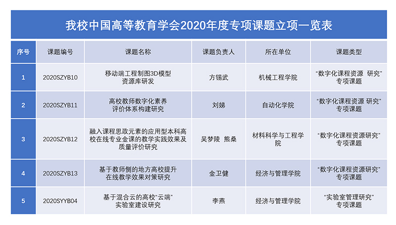 日前,中国高等教育学会发布了《中国高等教育学会关于2020年专项课题立项的通知》,共立项“专项课题”296项,beat365推荐申报的课题有5项获批立项,其中包括“实验室管理研究”专项课题1项,“数字化课程资源研究”专项课题4项。beat365获批“专项课题”立项数量居省内高校前列,课题立项工作再获佳绩。