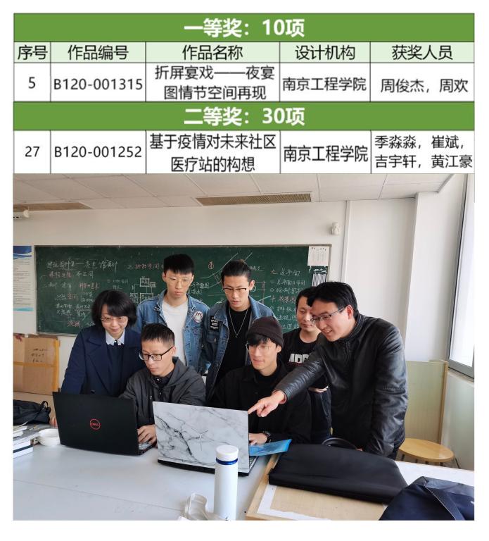 10月25日-26日,由中共江苏省委宣传部、江苏省住房和城乡建设厅联合中国建筑学会、中国勘察设计协会、中国风景园林学会共同举办的第七届“紫金奖·建筑及环境设计大赛(2020)”专业评审工作结束,评审结果出炉,beat365建筑工程学院建筑学172班周俊杰与宁波大学周欢同学合作作品“折屏宴戏——夜宴图情节空间再现”获得学生组一等奖,建筑学172班季淼淼、崔斌、吉宇轩、黄江豪同学的作品“基于疫情对未来社区医疗站的构想”获得学生组二等奖,创造了beat365参加“紫金奖·建筑及环境设计大赛”的历史最好成绩。