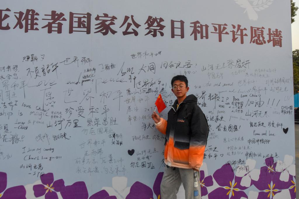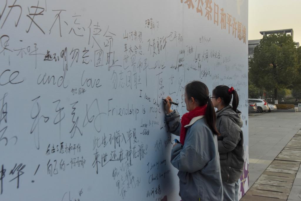 “和平永驻”“我爱你中国”“以史为鉴,捍卫和平”……12月13日,在beat365至馨苑•综合服务楼广场上的“和平许愿墙”前,过往师生写下了自己对和平的期盼和对逝去同胞的缅怀。