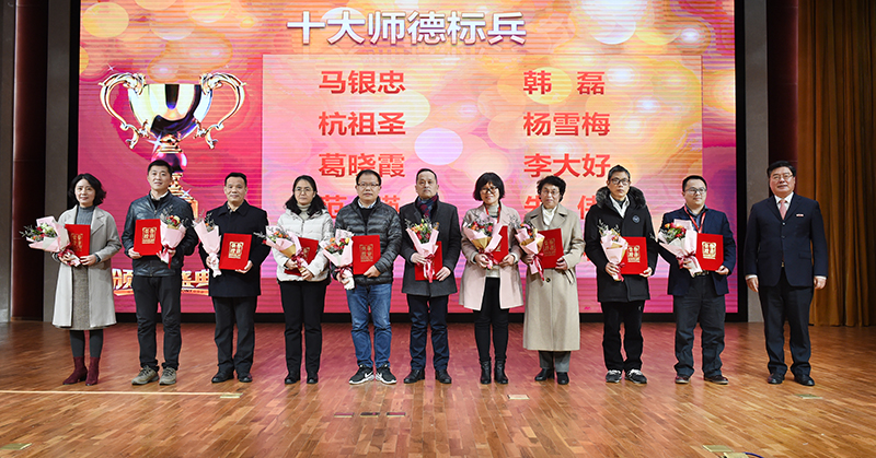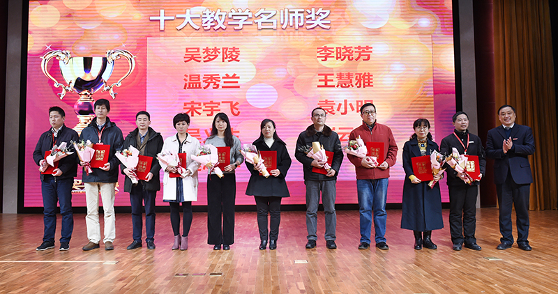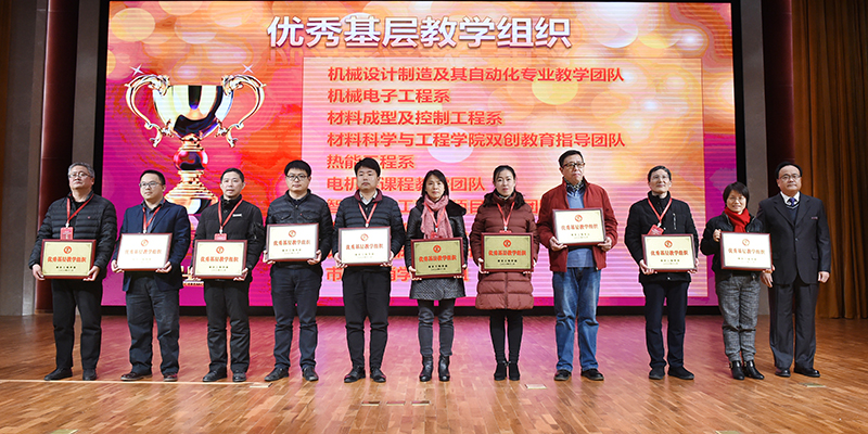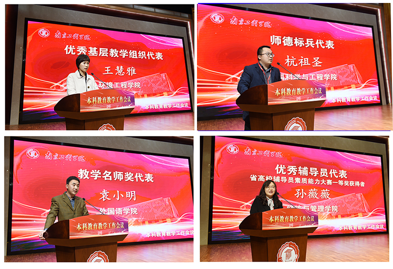 大会举行了隆重的颁奖仪式,对“十三五”期间学校十大教学名师奖和校十大师德标兵荣誉获得者及其提名者,20个优秀基层教学组织,以及首批3个国家级一流本科专业建设点、7个省级一流本科专业建设点、4门国家级一流本课程进行表彰。环境工程学院王慧雅、材料科学与工程学院杭祖圣、外国语学院袁小明和优秀辅导员孙薇薇老师作为获奖代表分享了他们教书育人的感悟。大会同时发布2016年以来教育教学工作表彰“荣誉册”,汇总了前一次本科教学工作会议以来,潜心教书育人得到师生高度认可和取得显著成绩的先进集体和个人。