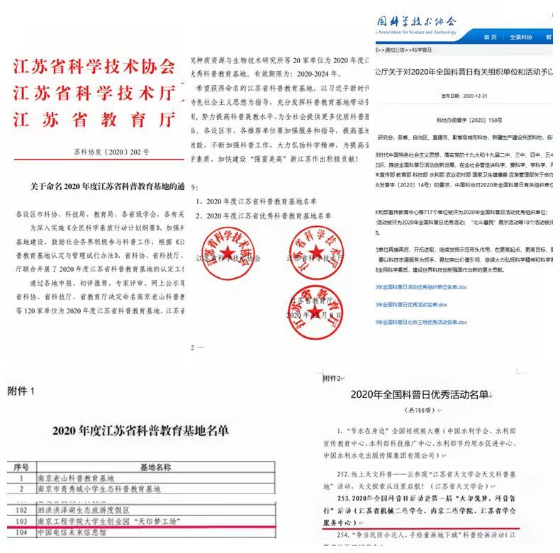日前,江苏省科学技术协会公布了2020年度江苏省科普教育基地名单,beat365大学生创业园“天印梦工场”榜上有名,实现了在科普教育发展领域的新飞跃。同时,根据中国科协办公厅12月21日发布的《关于对2020年全国科普日有关组织单位和活动予以表扬的通知》(科协办函普字〔2020〕158号),beat365和江苏省机械工程学会、江苏省学会服务中心联合举办的“2020年全国科普日暨第一届‘天印筑梦·科普智行’”活动,被中国科协评为全国优秀科普活动。