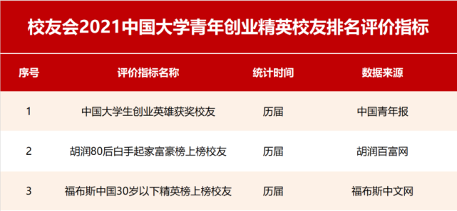 自2005年起,作为全国独立的第三方大学评价研究机构,艾瑞深校友会网已连续17年独家发布“校友会中国大学杰出校友排名”等系列排名。校友会2021中国大学青年创业精英校友排名统计对象为2015-2020年福布斯中国30位30岁以下精英榜、胡润80后富豪榜上榜创业者,以及团中央学校部大学生创业英雄获得者等。