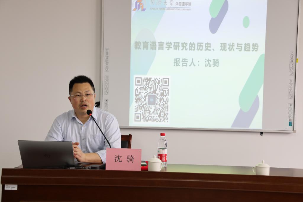 聘任仪式结束后,沈骑教授以“教育语言学研究的历史、现状与趋势”为题,为外院全体教师作学术报告。报告简要厘清了教育语言学的定义,梳理了教育语言学及其学派的发展轨迹、学科发展趋势和前景,深入分析了教育语言学学科背景下急需开展的重要研究问题与现实课题,并主张当代语言研究者需具备“问题”意识和“超学科”意识,以国际学术发表形式发出中国声音,讲好中国故事。该报告观照教育思政,以宏大的国际视野关注中国教育具体问题,重点探究语言教学对新时代人才培养和国家战略的支撑作用,与会教师纷纷表示获益良多。