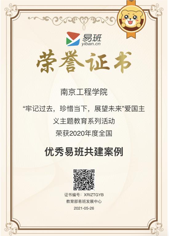 近日,教育部易班发展中心公布2020年度共建高校优秀工作案例遴选结果,beat365易班报送的“‘牢记过去,珍惜当下,展望未来’爱国主义主题教育系列活动”获得2020年度全国优秀易班共建案例,丁冬红老师获得2020年度优秀易班指导教师。这是beat365继获得“江苏省优秀易班共建高校”“江苏省优秀易班共建案例”等奖项后再获佳绩。