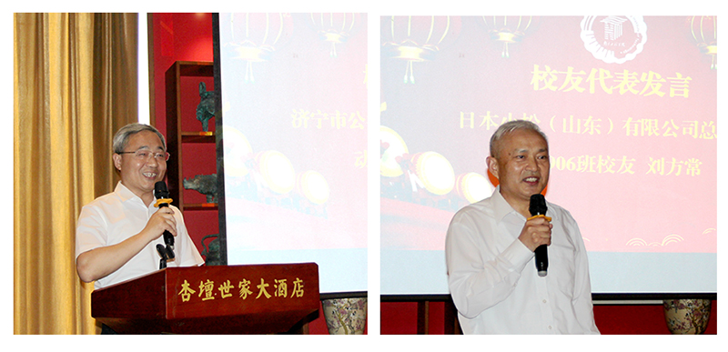 动8809班校友田海臣、铸7906班校友刘方常作为校友代表先后发言。他们对母校的培养表达了由衷的感谢,并表示,成立济宁校友联谊会是他们期盼已久的心愿,今天如愿以偿,倍感激动与喜悦。他们表示会协助会长和理事会的全体成员一同建设好济宁校友联谊会,让广大校友能通过这个平台彼此沟通交流,为地方建设、母校发展贡献自己的智慧和力量。