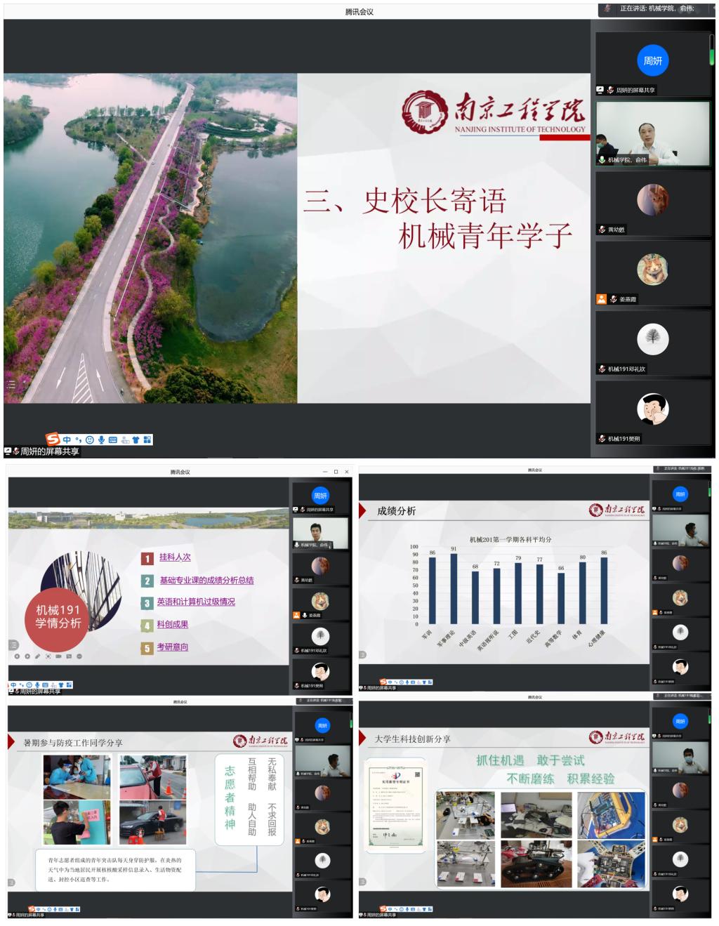 一踏入工程实践中心会议室,史金飞院长便来到了电脑摄像头前,加入到由机械191班和机械201班共同举办的“科学防控、迎接开学”线上主题班会中。史金飞院长通过班会向同学们介绍了学校近期采取的严格的防疫措施和留校学生的学习生活情况,他指出,随着疫情好转,南京市现已全部转为低风险地区,我们的校园也非常安全,请大家放心。为了确保同学们的安全和健康,他嘱咐大家严格按照学校要求,配合做好“日报告”“零报告”等常态化工作,切实做好个人防护,以健康的身体和积极的心态做好线上报到和在线学习,安心等待学校关于返校的进一步通知。