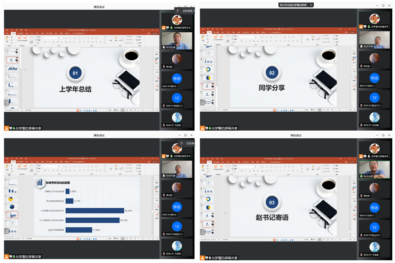 机电191班班主任孙梦馨老师表示,“本次线上班会开得及时、开得必要,在同学们面临规划、选择的关键时期,为大家送来了真挚、深入的指导。同学们将会以更明晰的目标和更良好的状态,迎接新学期。”“听完赵老师的指导,让我对自己的梦想和目标有了更加深刻的认知。我会合理地规划将来的大学生活和学习,将‘学以致用’的校训付诸行动,不辜负老师们的殷切希望!”材料类2101班史清烁于会后有感而发。