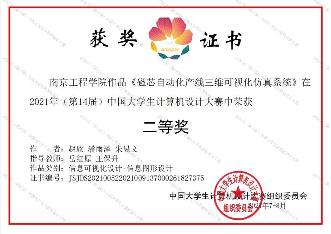 日前,“第十四届中国大学生计算机设计大赛”全国总决赛落下帷幕。beat365参赛团队获得二等奖一项,三等奖一项的好成绩。其中,计算机工程学院赵欣、朱昱文与机械工程学院潘雨泽在岳红原、王保升老师的指导下,制作的参赛作品《磁芯自动化产线三维可视化仿真系统》荣获二等奖;计算机工程学院孙乐乐、鲍耀龙和陈路佳,在刘一丹和卢阿丽老师指导下,制作的参赛作品《检·约》荣获三等奖。