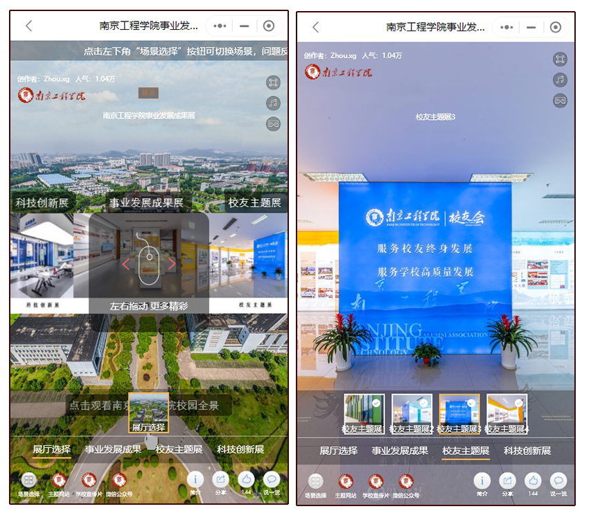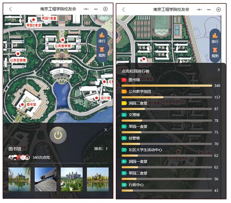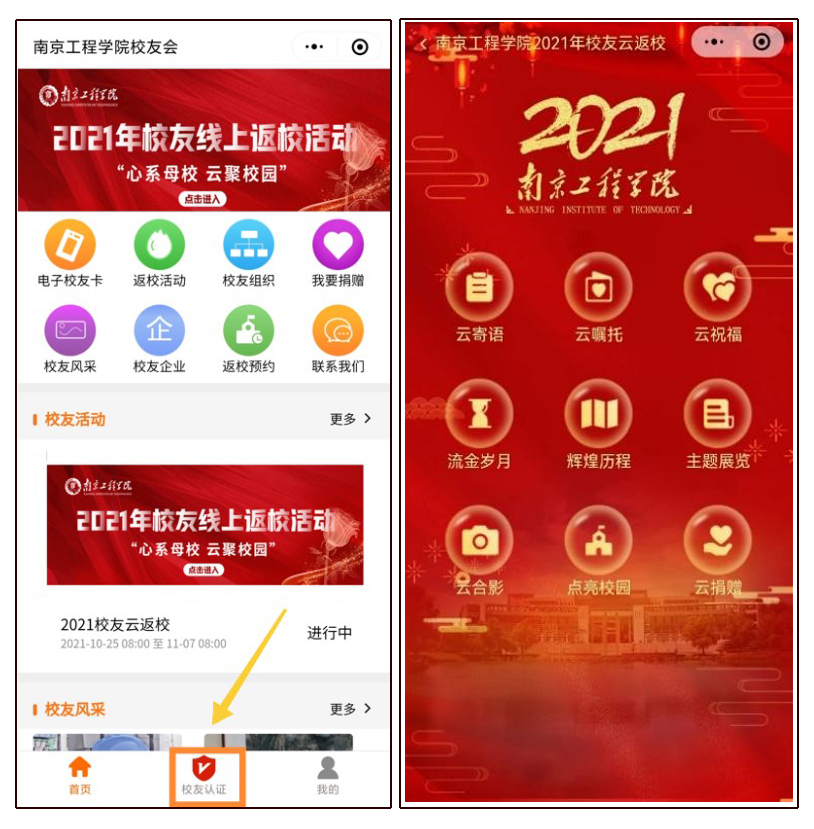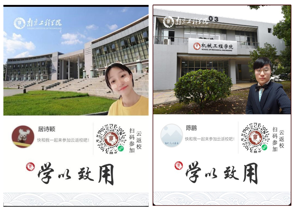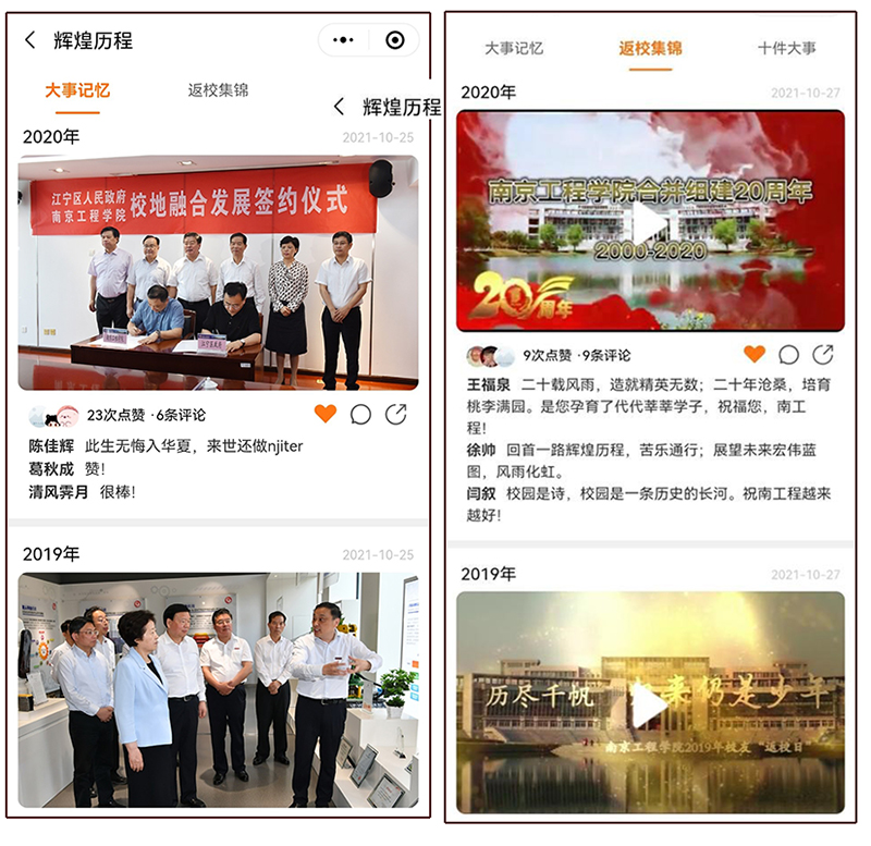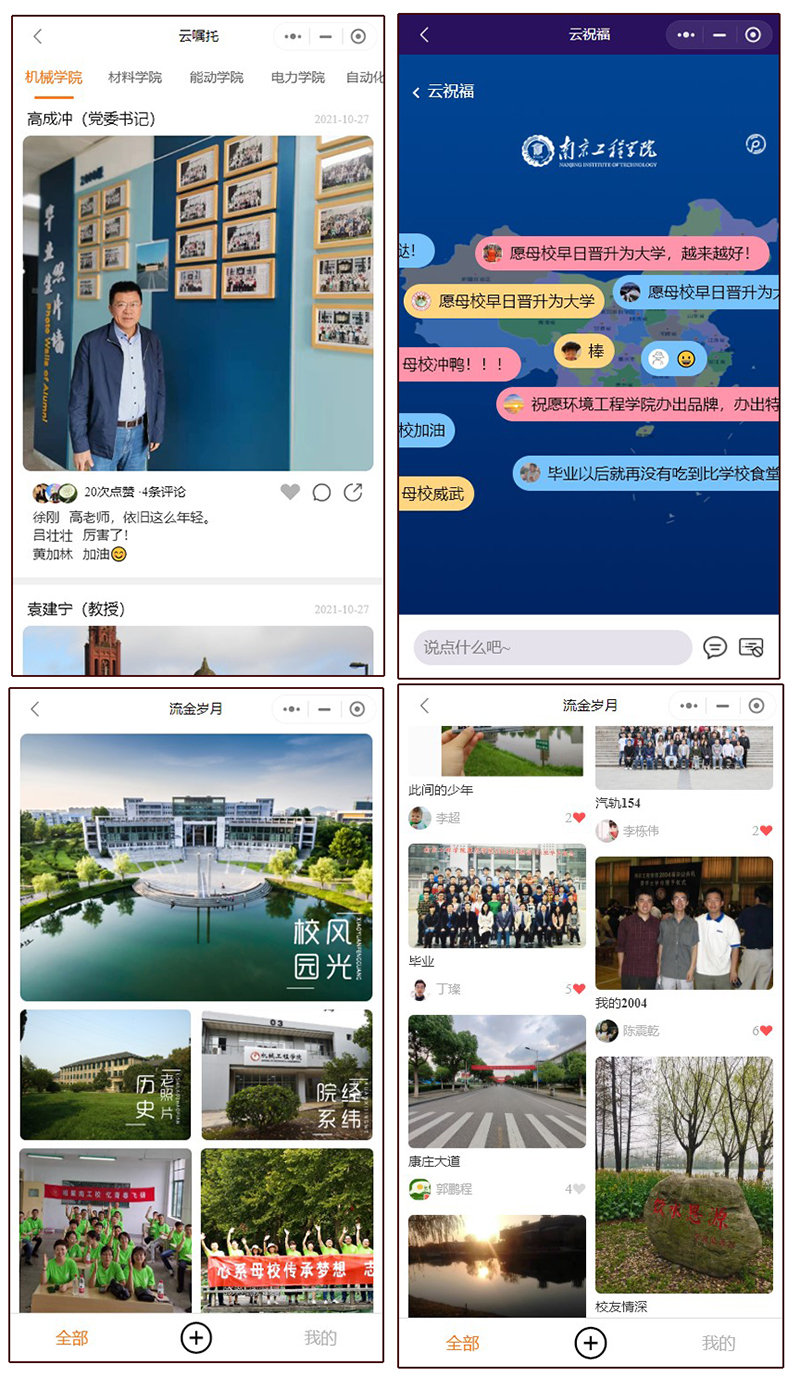 在云端,校友们能够领略南工程的历史与荣光,每年的发展大事记、返校日的视频集锦以及事业发展成果展、校友主题展、科技创新展这三大主题展览都放到了云端,视频清晰流畅,校友们线上观看,宛如身临其境,漫步校园。教学楼、图书馆、宿舍楼、食堂……,校友们通过小程序还能看到留下了学生时代点点滴滴的校园每一处角落,他们通过“点亮校园”模块,纷纷点亮校园中那最钟爱的回忆;借助“云合影”模块,他们踊跃上传个人照片,收获与母校的云上合照,留下了与母校的专属印记。