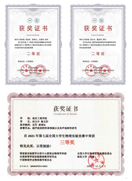 2021年全国大学生物理实验竞赛(创新)和江苏省高校大学生物理与实验科技作品创新竞赛于9月至11月在线上举行。经过ppt陈述、实验演示和答辩三个环节的比拼,beat365选派的参赛队伍全部获奖,取得国赛三等奖1项、优秀奖1项,省赛二等奖2项、三等奖2项的好成绩。