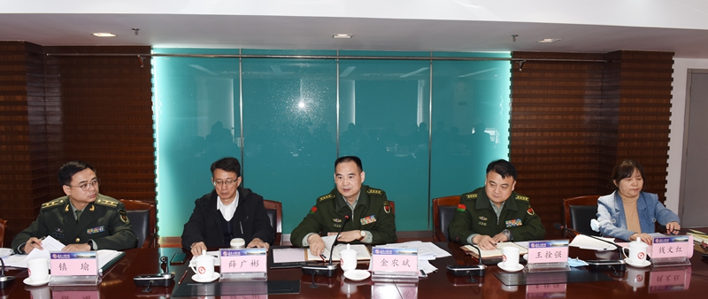 金农斌大校一行在党委书记史国君,党委常委、副院长张仰飞的陪同下,参观了学校人武部,实地观摩了一体化国防教育宣传阵地。随后,调研组一行在至勤楼·行政中心北303会议室进行座谈,座谈会由江苏省军区动员局局长韩涛主持。