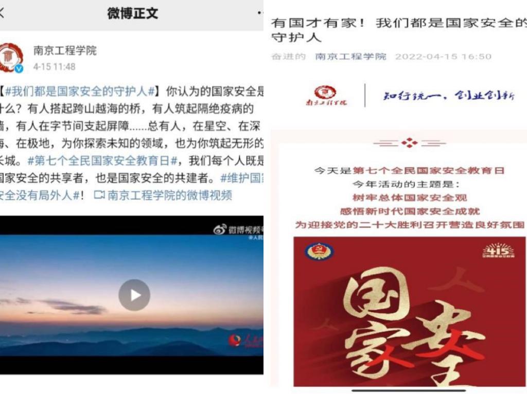 为了加强人人参与、人人可为的国家安全教育,学校制作专题宣传展板摆放于行政大厅、北大活广场、食堂等师生员工经常出入的地方,利用公共场所内的电子屏滚动播放安全教育宣传画。借助官网、官方微信、官方微博等渠道,发布全民国家安全教育日相关知识和视频学习资料,积极参加国家安全教育日的线上话题互动。发动学校全体中层干部、保密干部在微信朋友圈转发保密教育宣传海报,增强了师生的国家安全意识和保密意识。