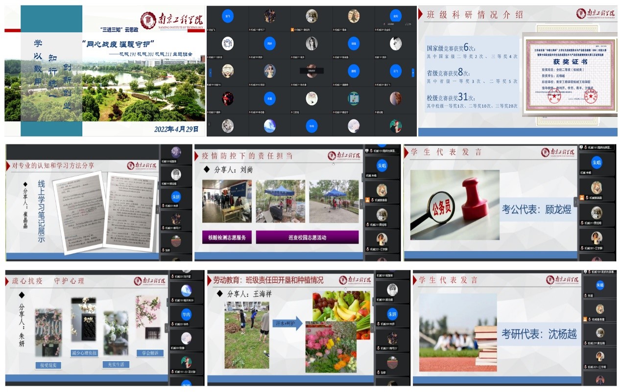 4月29日中午,本是午休小憩的时间,但在机械191、机械201、机械211三个班级同学的宿舍里,大家都聚精会神地端坐在电脑、手机屏幕前,时而专注聆听,时而热烈讨论。原来,班级的第二班主任,校党委副书记、院长史金飞老师正通过视频连线,参加班级联合举办的“同心战疫 温暖守护”主题云班会。