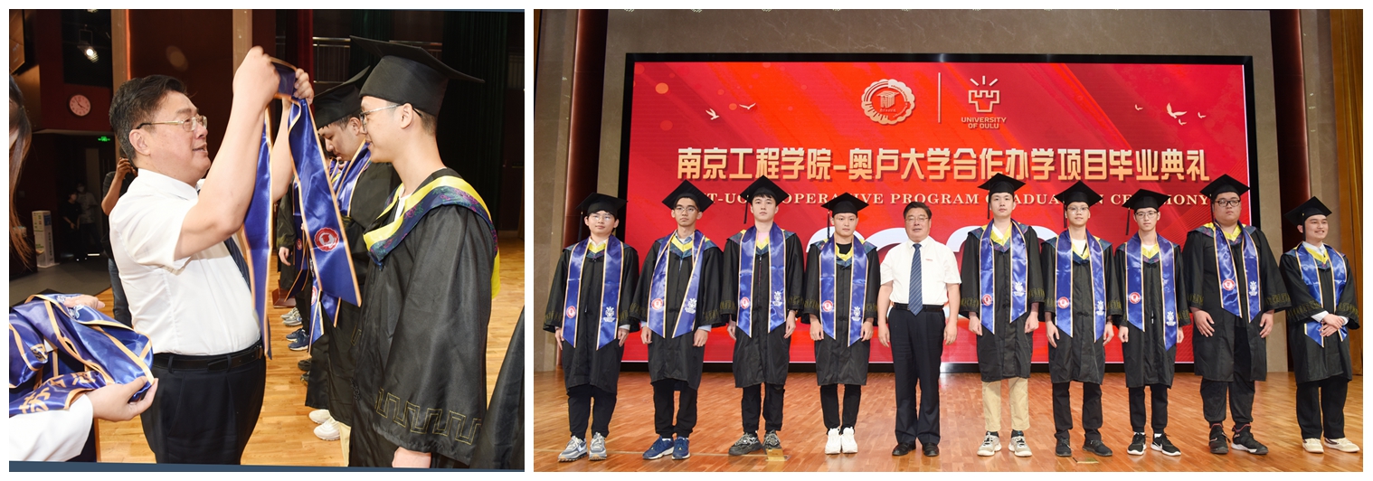 毕业典礼上,党委副书记濮励杰宣读了中芬合作办学项目荣誉毕业生名单,党委书记史国君为受表彰学生披荣誉绶带。
