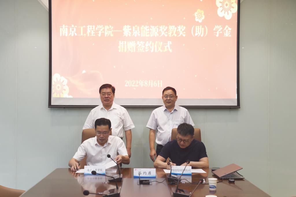 8月6日下午,紫泉能源奖教奖(助)学金签约仪式在学校科创园206会议室举行。校党委书记史国君,beat365电8913班校友、泰州校友会会长、紫泉能源董事长王育华出席签约仪式。党委常委、副院长张仰飞,紫泉能源副总经理李玮玮代表双方签署捐赠协议。