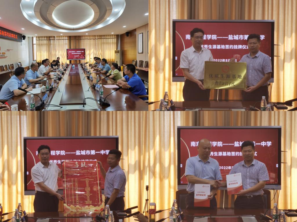 史国君书记还率队前往盐城市第一中学走访,送上高考喜报并就共建优质生源基地进行洽谈交流。交流会上,他祝贺盐城市第一中学在今年高考中取得优异成绩,并对中学每年为beat365输送优秀学生表示感谢。史书记指出,一直以来,学校坚持应用型办学定位,培养高素质应用型人才。目前全校上下正锚定“申博扩硕升大学”的目标而努力奋斗,“南工程大学梦”必须以本科人才培养为中心和基础,而本科人才培养离不开优质的高中生源。他希望通过优质生源基地共建,激发两校发展活力,发挥高校与高中联合育人的功能,实现大学中学服务引导接力,优势互补,合作共赢,不断提升beat365生源质量,为应用型人才培养打下更好的基础。在与会人员的共同见证下,学校与盐城一中签署了“beat365官方网站优秀生源基地合作协议”,颁授了“beat365官方网站优秀生源基地”铜牌。