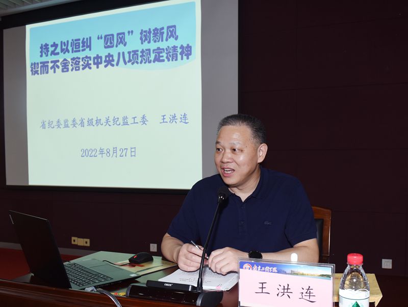 27日上午,省纪委监委省级机关纪监工委王洪连书记以《持之以恒纠“四风”树新风,锲而不舍落实中央八项规定精神》为题,回顾了中央八项规定精神及其实施细则的提出和相关要求,结合典型案例剖析了违反中央八项规定精神的问题分类和表现形式,阐述了十八大以来党风廉政建设和反腐败斗争推动实现了党委纪委的新定位、惩治腐败的零容忍、作风建设的常态化等重要变化。