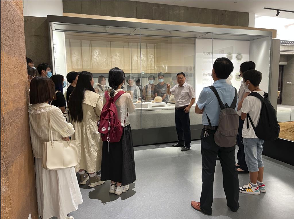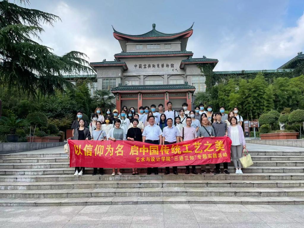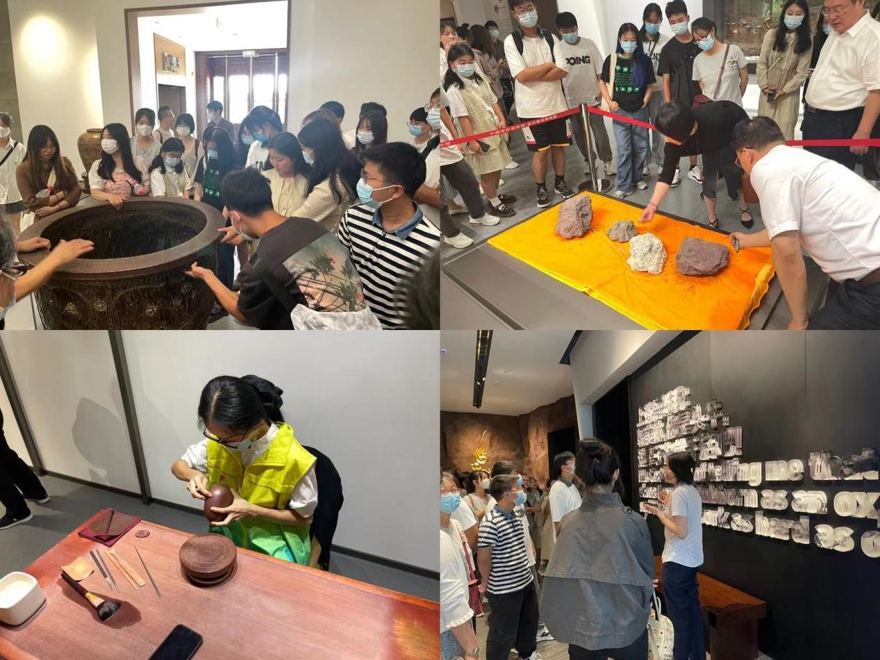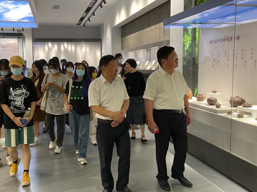 在宜兴陶瓷博物馆,周小东馆长热情接待了史书记一行。他说,作为国内最早成立的专业性陶瓷博物馆,这里展出的古陶、名人名作、紫砂、精陶、美彩陶、均陶、青瓷等精美展品都见证着宜兴悠久的制陶历史和灿烂的陶瓷文化。从宜兴的历史文化到江苏独有的宜兴“陶式生活”,从紫砂泥料到烧制工艺,周馆长给现场师生上了一堂别开生面的紫砂文史知识课,“宜兴陶瓷是历代劳动人民、匠师、紫砂艺人的伟大创造和智慧的结晶,希望同学们结合专业继承和发扬这份宝贵的艺术遗产,做未来工艺美术业的新星。”