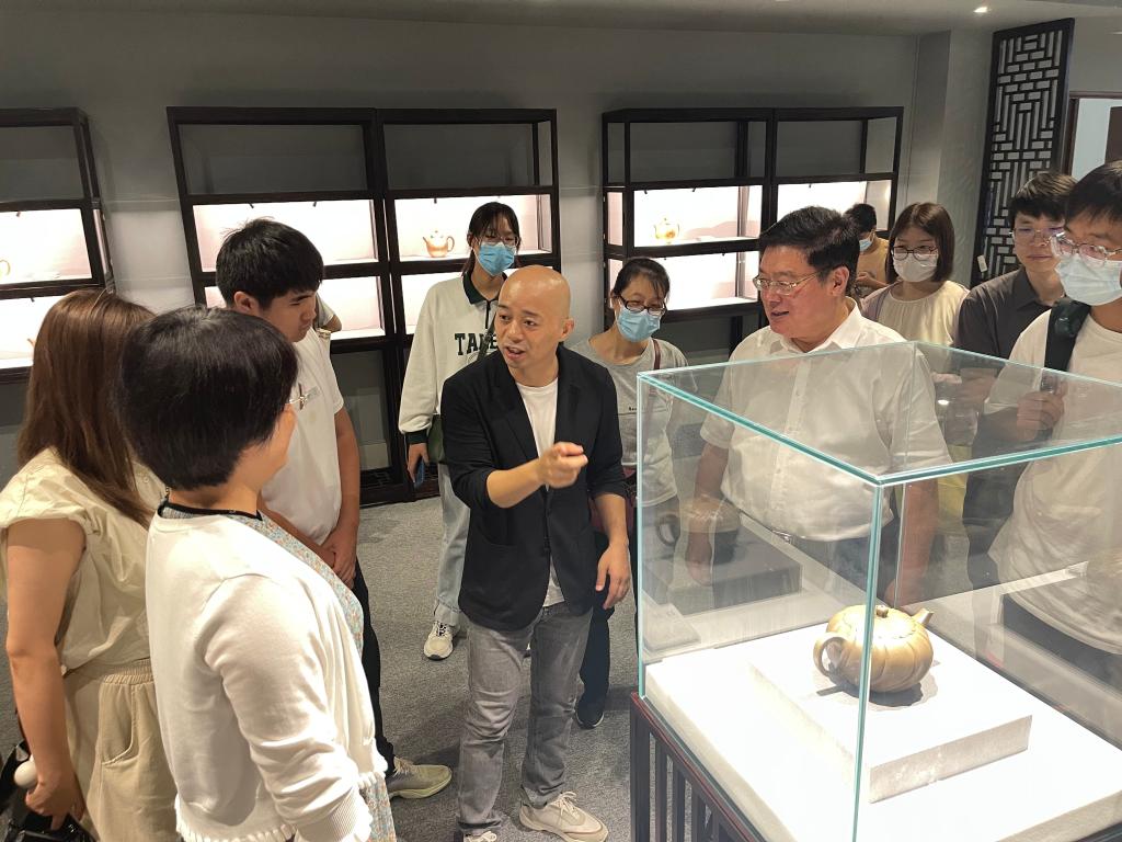 “‘买田阳羡吾将老,从初只为溪山好。’这是苏东坡的一句诗,也道出了他与宜兴的渊源。”“一项技艺的兴盛与传承,一定离不开技艺背后‘人’的努力。”在史国君书记的带领下,师生一行参观了雅达阳羡溪山小镇,走进章剑华人文空间、紫砂汇、宜兴文创中心,进一步感知宜兴的历史、环境、人文,以及蕴含其中的文化魅力与工匠精神。“自2017年10月学校与宜兴市正式签订全面战略合作协议以来,学校每年与宜兴定期开展校地专场招聘会,为宜兴输送优秀毕业生,一批校友扎根宜兴、与企业共成长,取得了优异成绩。”史书记还为同学们介绍了学校与宜兴结下的“不解之缘”,“对于工美专业同学们来说,这次的参观学习不仅是一次体验宜兴陶瓷文化的机会,更是一个深化专业教育的平台,希望同学们亲眼看、亲手触、亲耳听,让书本理论知识与实践认知操作碰撞出灵感的火花,用匠心守护传统工艺,给人以美的感受和体验。”