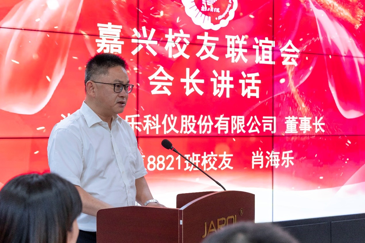 新当选会长肖海乐代表第一届校友会理事会讲话。他对远道而来的学校老师和兄弟联谊会代表表示衷心感谢,他表示将会团结校友联谊会的全体成员,进一步建立和完善理事会的议事规则和工作制度,为校友联谊会的长远发展提供保障。同时也将充分发挥好校友联谊会的桥梁纽带作用,促进母校与嘉兴市五县两区各界之间的沟通和联系,为母校改革发展、为建设更加美好的嘉兴不懈努力。