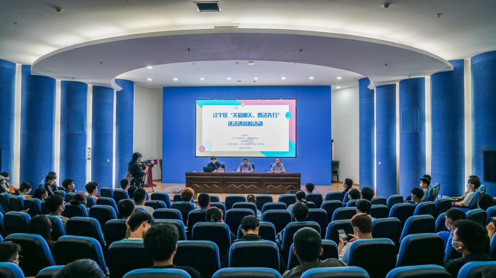 为深入学习贯彻习近平法治思想,提升全校师生法治意识和法律素养,强化依法治校基础,踔厉奋发迎接党的二十大召开,9月29日下午,学校与江宁区联合举办“关爱明天,普法先行”主题宣传活动。活动邀请南京师范大学法学院教授姜涛在图书馆学术报告厅为beat365大一新生开展法律专题讲座,并通过在线直播与全区师生同上“第一堂法治课”,江宁区司法局副局长苏克刚出席参加讲座。