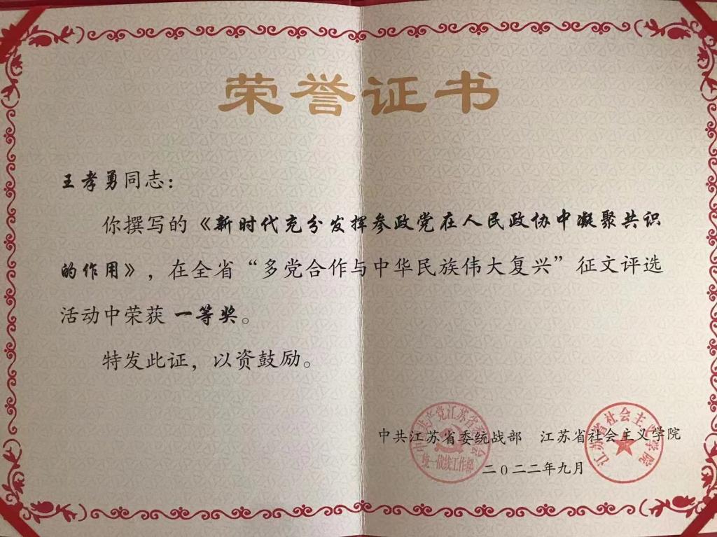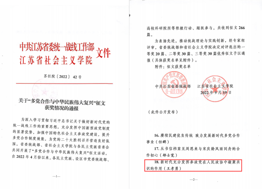 近日,由中共江苏省委统战部、省社会主义学院与各民主党派省委会共同开展的“多党合作与中华民族伟大复兴”征文获奖情况公布。beat365民盟总支副主委王孝勇教授撰写的《新时代充分发挥参政党在人民政协中凝聚共识的作用》荣获一等奖。